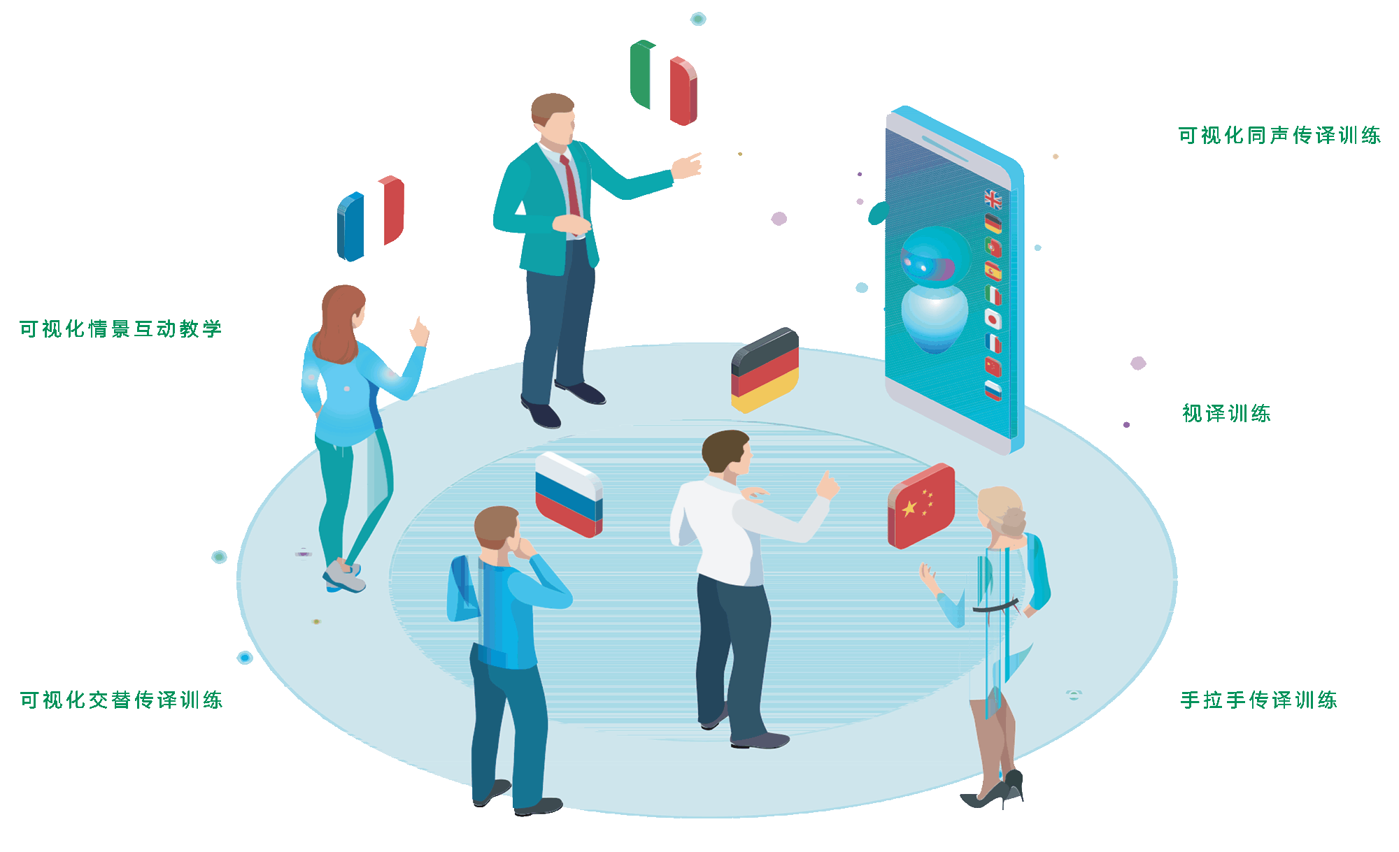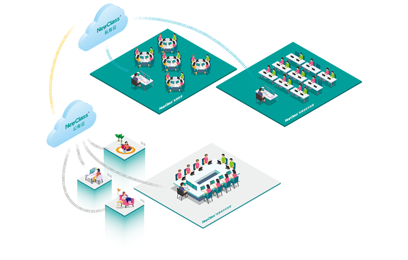 课堂交互教学活动:课件展示·可视对讲·分组讨论·口语训练·双轨录音·监听·课堂测试班内、校内和班外、校外:统一管理 · 统一教学 · 统一训练 · 统一评测。